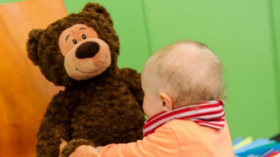 Teddy bear says, touch your ears,